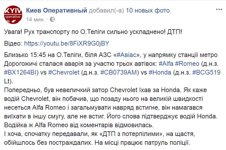 "Около 15:45 на Телиги, возле АЗС "Авиас", в направлении станции метро Дорогожичи произошла авария с участием трех автомобилей: #Alfa #Romeo (д.н.з. # BX1264BI) vs #Chevrolet (д.р. с. # CB0739AM) vs #Honda (д.н.з. # BCG519 Lt).