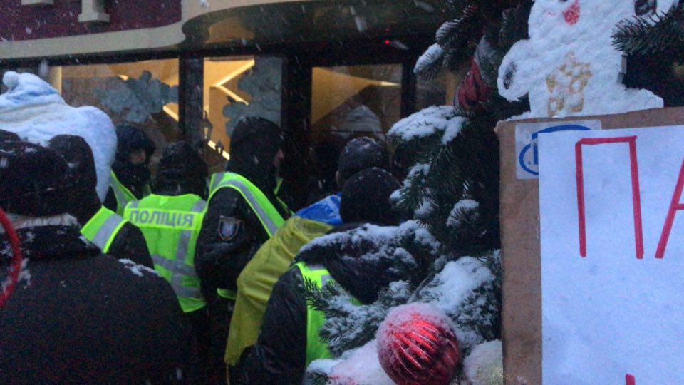 Как сообщает корреспондент "Страны", ранее активисты побили елочные игрушки на елке перед магазином.