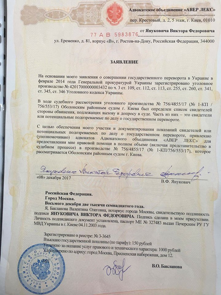 Беглый президент вернул в дело своих адвокатов, в частности, Виталия Сердюка. Янукович написал соответствующее заявление, которое заверил у российского нотариуса.