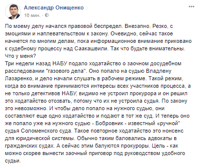 Нардеп Александр Онищенко рассказал о том, что "газовое дело" попало в руки судьи Соломенского райсуда Киева - Александра Бобровника. Об этом Онищенко написал на своей странице в Facebook.