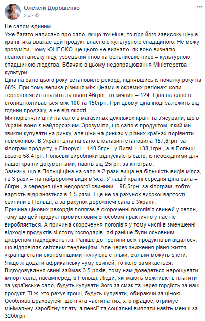 "Причина ценовых рекордов заключается в сокращении поголовья свиней у жителей сел, так как этот продукт промышленным способом практически у нас не производится", - пишет Дорошенко.