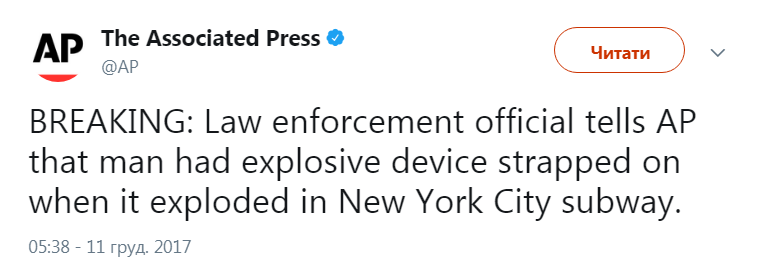 Напомним, что в понедельник, 11 декабря в Нью-Йорке на автовокзале Манхэттена произошел взрыв, началась эвакуация.