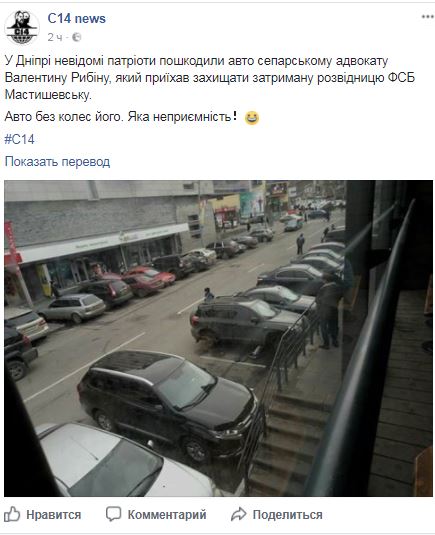 "В Днепре неизвестные патриоты повредили авто сепарскому адвокату Валентину Рыбину, который приехал защищать задержанную разведчицу ФСБ Мастикашеву. Авто без колес его. Какая неприятность!" - отмечается в подписи под фото.