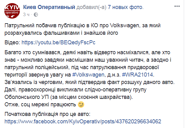 Один из патрульных прочитал публикацию о мошеннически купленном за фальшивые деньги автомобиле Volkswagen и сумел разыскать это авто.