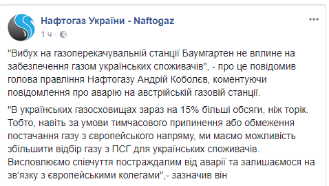Взрыв на центрально-европейском газовом хабе OMV в австрийском Баумгартене не повлияет на обеспечение топливом украинцев. Об этом сообщил глава госкомпании "Нафтогаз Украины" Андрей Коболев, передает пресс-служба компании в Facebook.