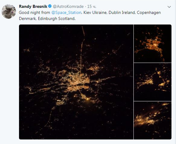 Американский астронавт Рэндольф Брезник, который сейчас находится в качестве бортинженера NASA на борту Международной космической станции, опубликовал снимок ночного Киева с орбиты. Фотографию он выложил на своей странице в Twitter.