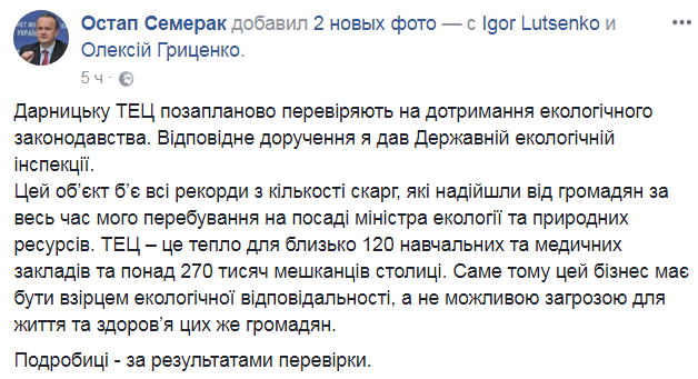 Поручение о внеплановой проверке сотрудникам Государственной экологической инспекции дал министр экологии и природных ресурсов Украины Остап Семерак. Об этом написал на своей странице в Facebook.