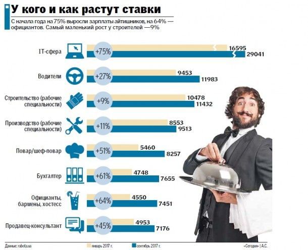Среди менее сложных профессий увеличены предлагаемые заработки в сфере обслуживания. Это продавцы-консультанты (+2223 грн с начала года), повара (+2800 грн), официанты (+2900 грн). Больше (+2900 грн) обещают платить и бухгалтерам.