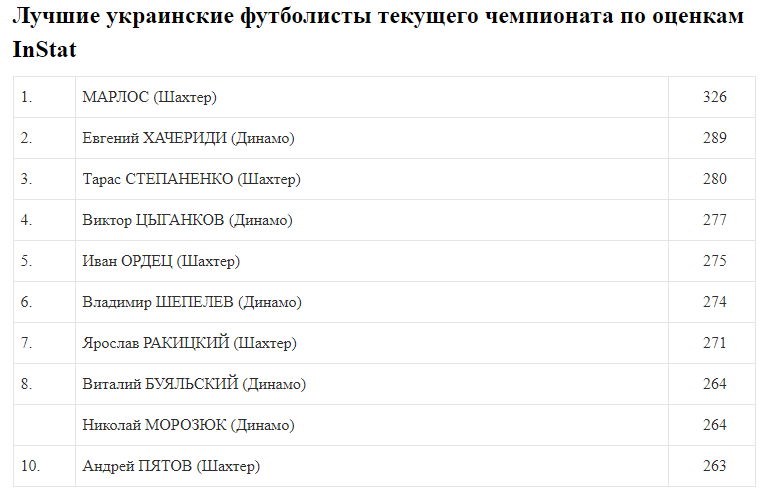 Международная  спортивно - статистическая компания InStat признала лучшим игроком нынешнего чемпионата Украины по футболу полузащитника Шахтера Марлоса.
