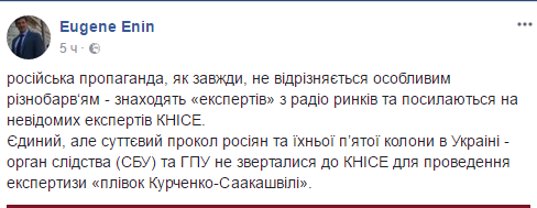 "Единственный, но существенный прокол россиян и их пятой колонны в Украине - орган следствия и ГПУ не обращались в КНИСЭ для проведения экспертизы "пленок Курченко-Саакашвили", - отметил Енин.