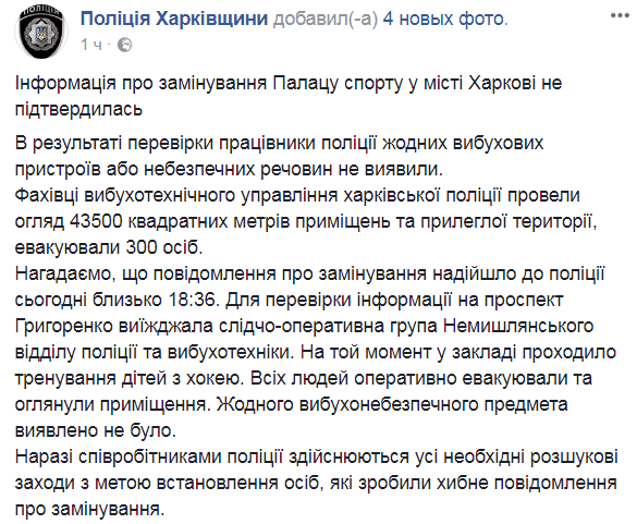 "На тот момент в здании проходила тренировка детей по хоккею. Всех людей оперативно эвакуировали и осмотрели помещения. Специалисты взрывотехнического управления харьковской полиции провели осмотр 43,5 тыс. кв. м. помещений и прилегающей территории, эвакуировали 300 человек. Никаких взрывоопасных предметов обнаружено не было", - указано в опубликованном сообщении.