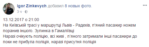 "Пьяный пассажир ножом ранил другого пассажира. Сейчас ожидают полицию, все живы, пьяного задержали другие пассажиры маршрутки ", - написал Игорь Зинкевич.