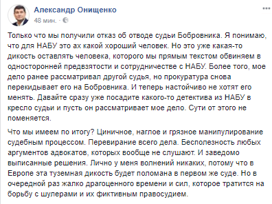 По словам нардепа, судья относится к делу предвзято и сотрудничает с Национальным антикоррупционным бюро. "Мое дело ранее рассматривал другой судья, но прокуратура снова перебрасывает ее на Бобровника. И теперь упорно не хотят его менять", - возмущается Онищенко.