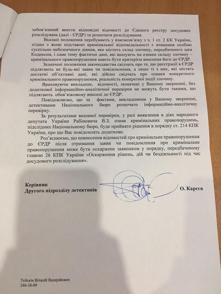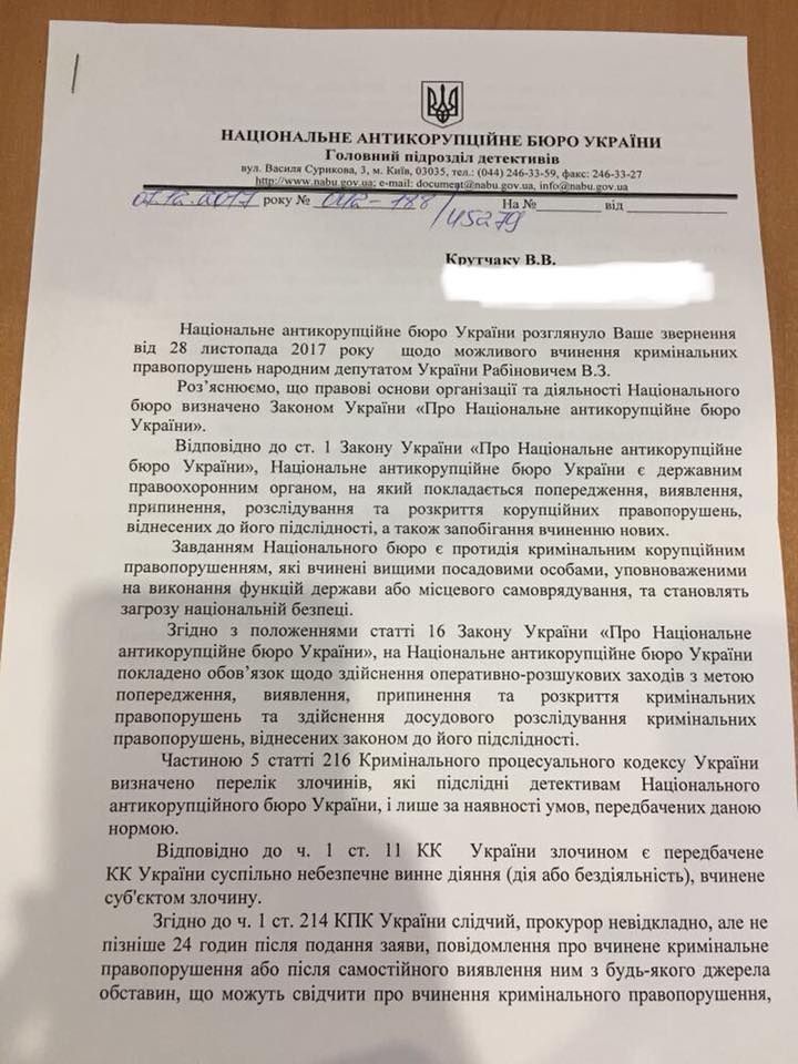 "Хоп! И вторая ласточка прилетела к Вадиму (Давиду) Рабиновичу. По моему обращению НАБУ проведет информационно-аналитическую проверку", - написал Крутчак.