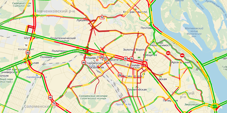 Проезд по мостам через Днепр и  Набережно-Кращатицкой местами свободен. Медленно "ползет" Набережное шоссе.