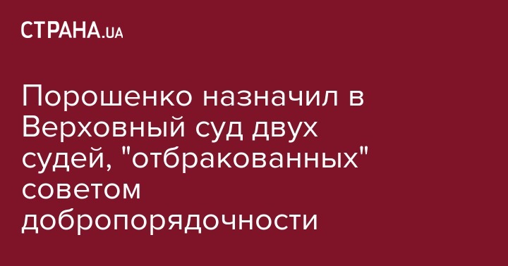 Петр Порошенко назначил судьями Верховного Суда двух судей, чьи кандидатуры были ветированы Общественным советом добропорядочности. Об этом сообщают "Украинские новости" со ссылкой на источник в АП.
