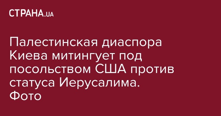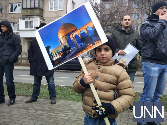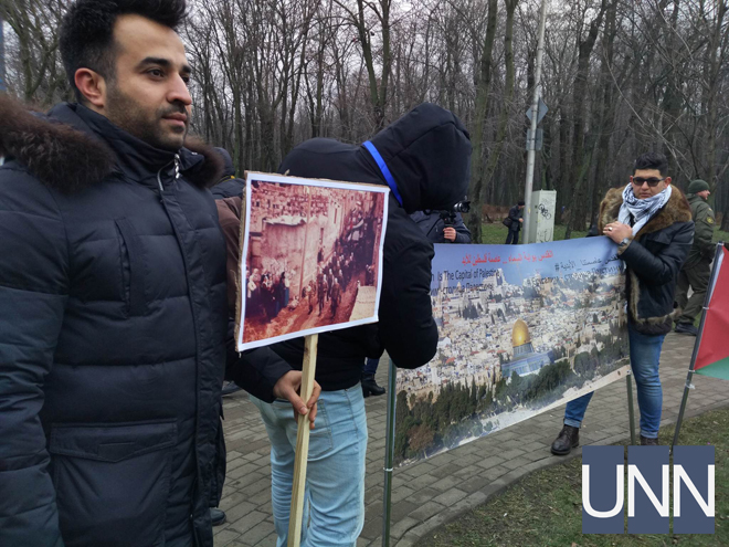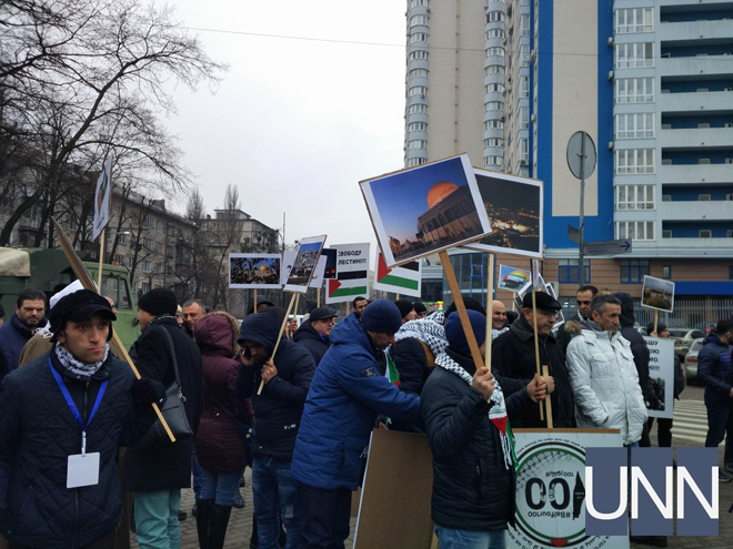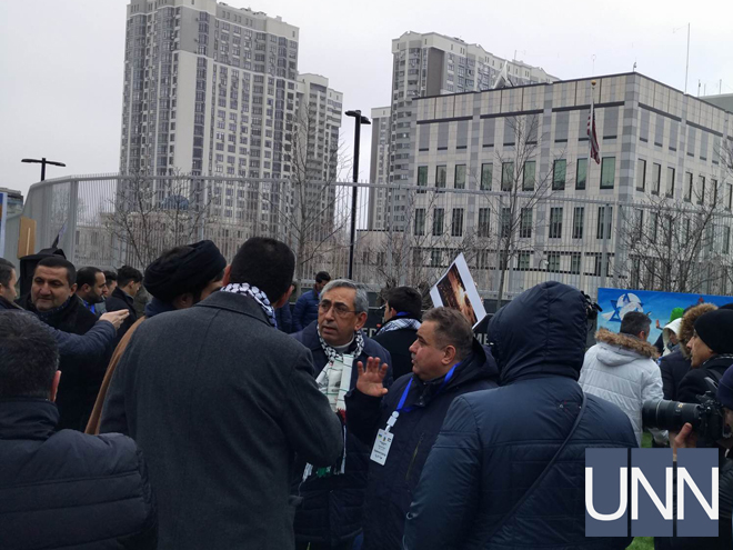 В частности, организаторы мероприятия под стенами посольства - палестинская диаспора в Украине - заявили, что акция устроена против срыва мирного процесса на Ближнем Востоке, вызванного решением американского президента Дональда Трампа о признании Иерусалима столицей Израиля.