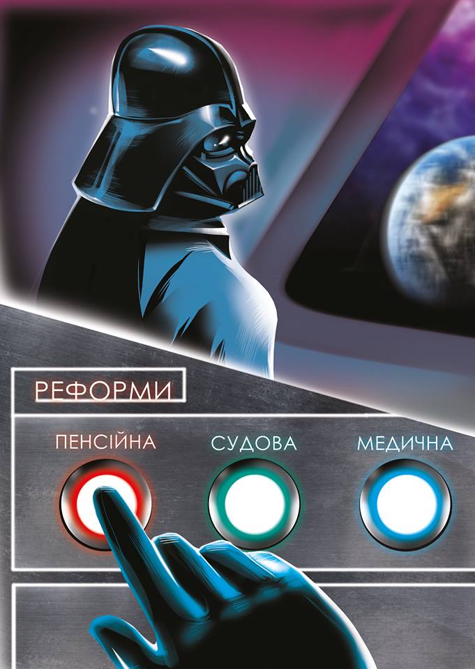 "Новая история о противостоянии света и тьмы, добра и зла начинается после бегства Хана Яна. В Галактике, где Дарт Порох (шагает с тортом "Рошен", пьет чай и нажимает на кнопки реформ - Прим.Ред.) решил уничтожить восставшую планету, героиня Ю-Лея пробудила в себе Силу и стала на сторону повстанцев, чтобы выступить против темных сил", - сказано в сообщении.