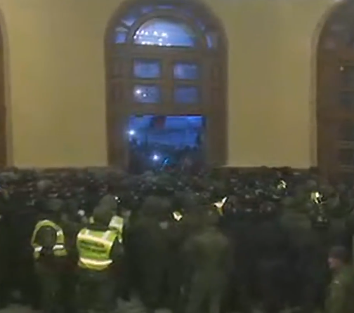 Возле него возникла давка - полиция не пускала  протестующих внутрь. Произошли потасовки, правоохранители распыляли газ, а митингующие разбили окна.