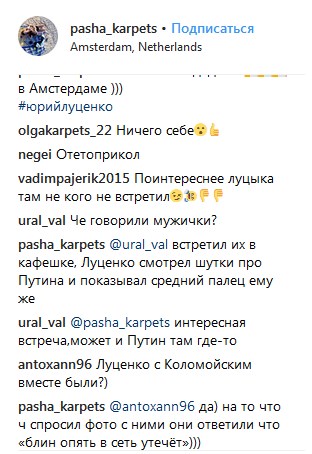 Студент Павел Карпец стал очевидцем встречи Генерального прокурора Украины Юрия Луценко и экс-владельца "Приватбанка" Игоря Коломойского в Амстердаме. Фотографии Карпец опубликовал 25 ноября на свой страничке в Instagram.