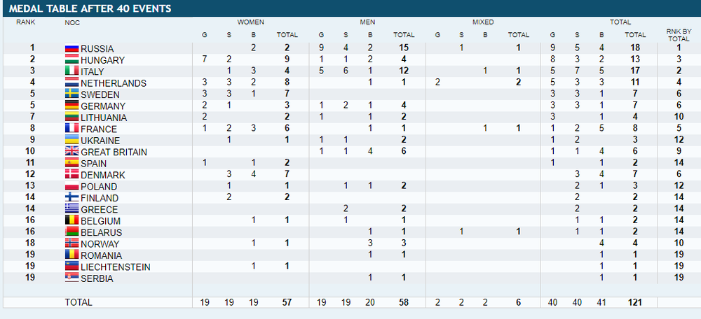 Второе место у команды Венгрии (8-3-2), а третьими стали итальянцы (5-7-5).