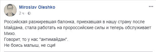 "Российская разжиревшая балонка, приехавшая в нашу страну после Майдана, стала работать на пророссийские силы и теперь обслуживает Михо. Говорит, то у нас "антимайдан". Не боись малыш, не сци!".