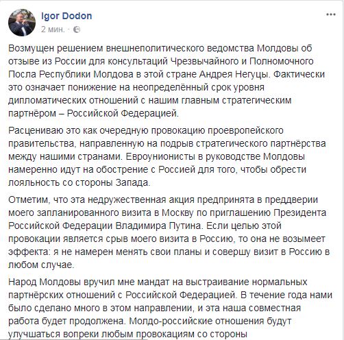 Вместе с тем, президент Молдовы Игорь Додон считает провокцией отзыв молдавского посла Андрея Негуцы из России. Об этом Додон уже заявил в Facebook.