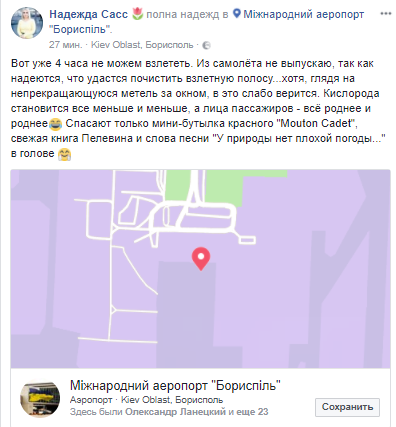 "Из самолета не выпускают, так как надеются, что удастся починить взлетную полосу. Кислорода становится все меньше.. а лица пассажиров - все роднее", - иронизирует журналистка, которая не теряет надежды на вылет.