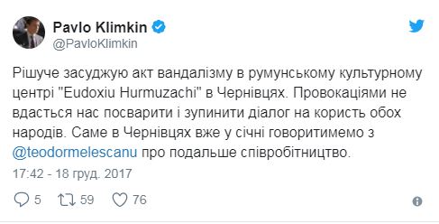 "Решительно осуждаю акт вандализма в румынском культурном центре "Eudoxiu Hurmuzachi" в Черновцах. Провокациями не удастся нас поссорить и остановить диалог в пользу обоих народов. Именно в Черновцах уже в январе будем говорить с министром иностранных дел Румынии Теодором Мелискану о дальнейшем сотрудничестве", - сообщил Климкин.