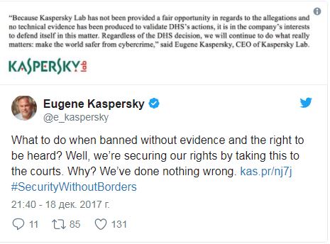 "Лаборатория Касперского" сотрудничество отрицает. Компания пообещала в начале 2018 года раскрыть исходный код программ и их будущих обновлений, чтобы их могли проверить независимые эксперты.