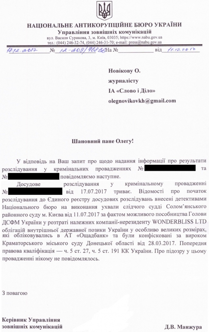 "Сведения о начале расследования в Единый реестр досудебных расследований внесены детективами НАБУ во исполнение решения судьи Соломенского райсуда Киева по факту возможного пособничества голове Госфинмониторинга в растрате облигаций внутреннего государственного займа, принадлежащих компании-нерезиденту Wonderbliss Ltd, в особо крупных размерах, учитывались в Сбербанке и были конфискованы по приговору Краматорского городского суда Донецкой области", - отмечает в письме Манжура.