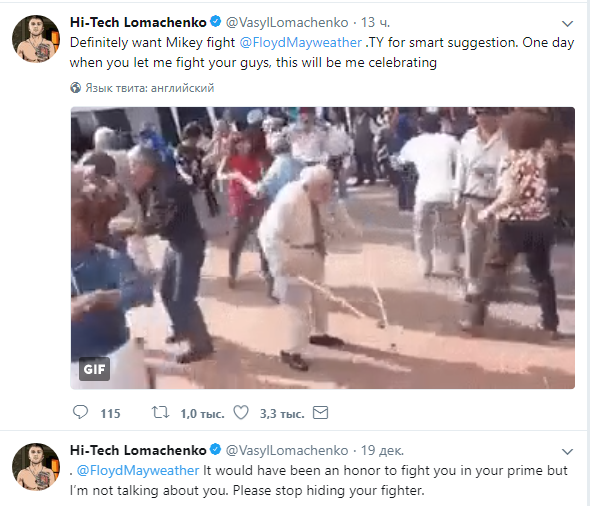 "Определенно хочу бой с Майки Гарсией. Спасибо за совет, Флойд Мэйвезер. Вот как я буду праздновать тот момент, когда ты позволишь драться против твоих парней", - написал Ломаченко и выложил забавное видео.