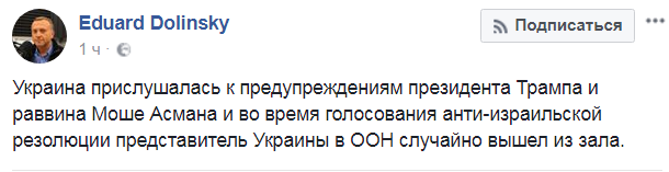 "Украина прислушалась к предупреждениям президента Трампа и раввина (главный раввин Киева и Украины от хасидов - Прим.Ред.) Моше Асмана и во время голосования анти-израильской резолюции представитель Украины в ООН случайно вышел из зала", - отметил Долинский.