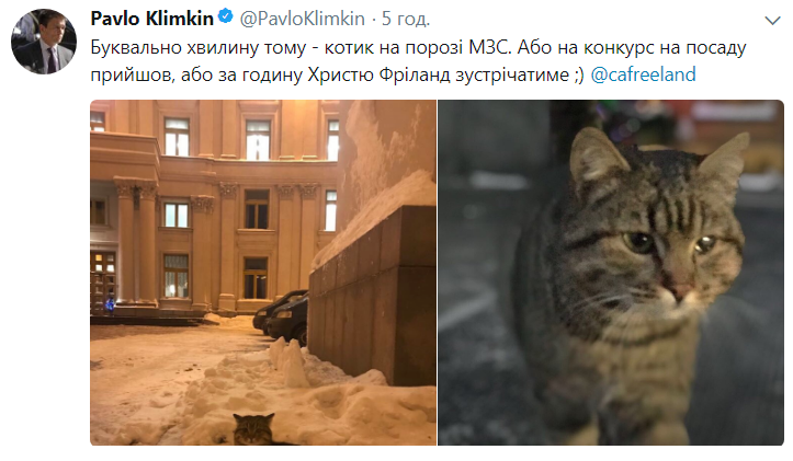 "Буквально минуту назад - котик на пороге МИД. Или на конкурс на должность пришел, или через час Христю Фриланд встречать", - написал Климкин в соцсети.
