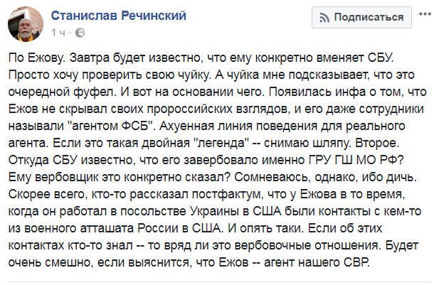 "По Ежову. Завтра будет известно, что ему конкретно вменяет СБУ. Просто хочу проверить свою чуйку. А чуйка мне подсказывает, что это очередной фуфел. И вот на основании чего.