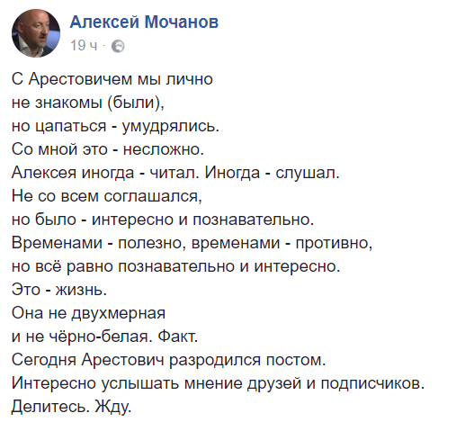 "С Арестовичем мы лично не знакомы (были), но цапаться - умудрялись. Со мной это - несложно. Алексея иногда - читал. Иногда - слушал. Не со всем соглашался, но было - интересно и познавательно. Временами - полезно, временами - противно, но всё равно познавательно и интересно.