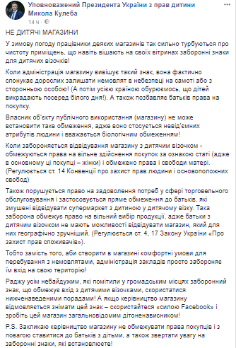 По словам Кулебы, размещая такой знак на двери магазина, администрация побуждает родителей оставлять младенцев одних в опасности или с посторонним лицом. При этом владелец объекта не имеет права устанавливать такое ограничение, поскольку нарушает права и свободы человека.