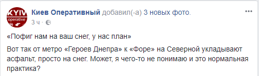 Возле станции метро "Героев Днепра" рабочих, которые укладывали асфальт в таких неподходящих погодных условиях, заметили прохожие и сфотографировали.