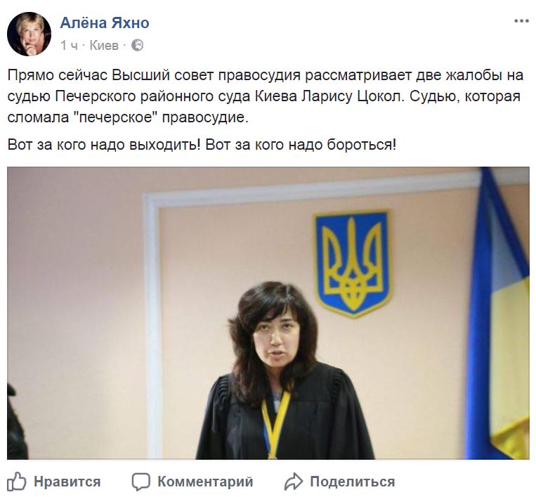 "Прямо сейчас Высший совет правосудия рассматривает две жалобы на судью Печерского районного суда Киева Ларису Цокол. Судью, которая сломала "печерское" правосудие. Вот за кого надо выходить! Вот за кого надо бороться!", - пишет Яхно.