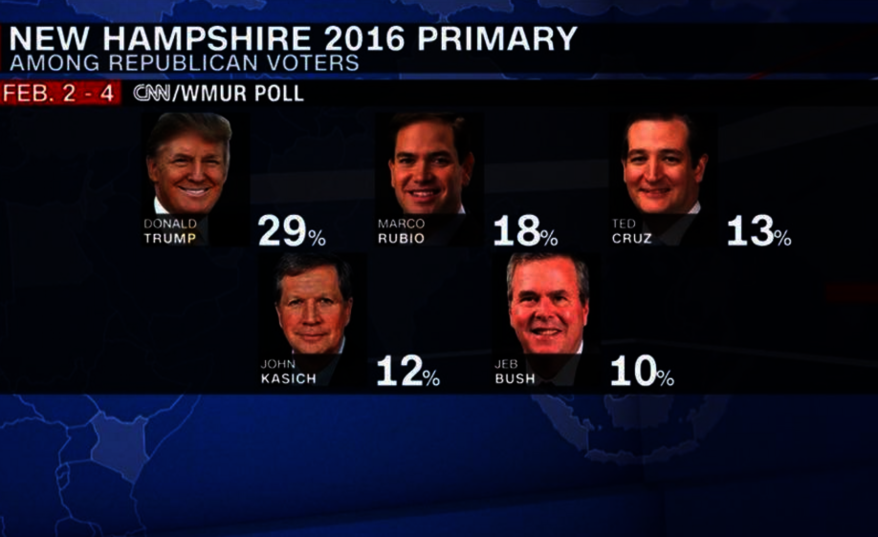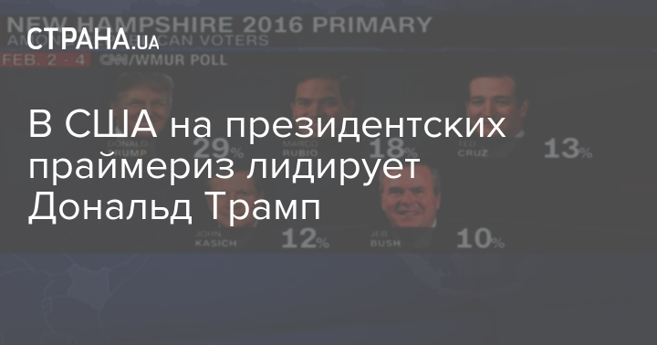 Согласно данным опроса, проведенного по заказу телекомпаний CNN и WMUR, Трампа готовы поддержать 29% избирателей-республикацев, а его ближайшего преследователя - сенатора Марко Рубио лишь 18%.