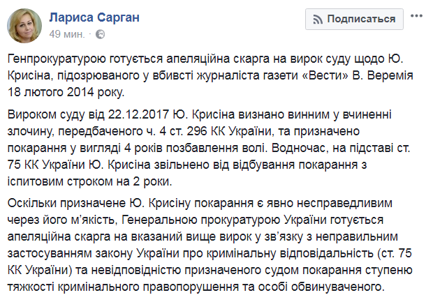 Поскольку предназначенное Ю. Крысину наказание является явно несправедливым из-за его мягкости, Генеральной прокуратурой Украины готовится апелляционная жалоба на указанный выше приговор в связи с неправильным применением закона Украины об уголовной ответственности (ст. 75 УК Украины) и несоответствием назначенного судом наказания степени тяжести уголовного преступления и личности обвиняемого", - сообщила представитель Генпрокуратуры Украины.