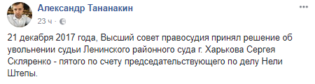Высший совет правосудия уволил харьковского судью Сергея Скляренко, который вел дело бывшего мэра Славянска Нели Штепы.