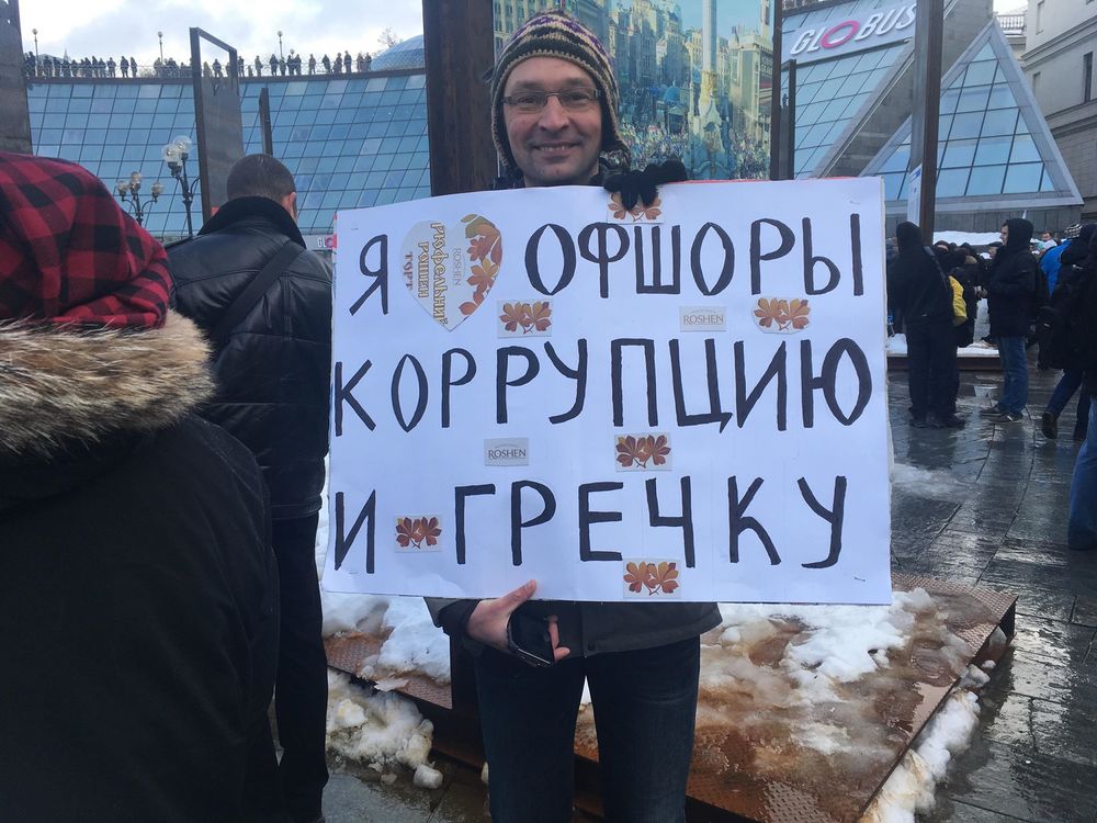 В полдень они встретились в центре столицы, чтобы выпить кофе и поесть конфет "Рошен" - последняя опция прямо была указана в анонсе события на Facebook.