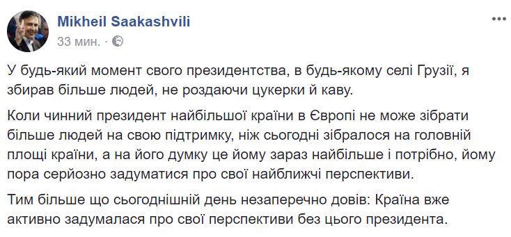 - Под конец митинга в Facebook выступил Михо, который заявил, что в любом грузинском селе собирал больше людей, чем Порошенко сегодня в многомиллионном Киеве.