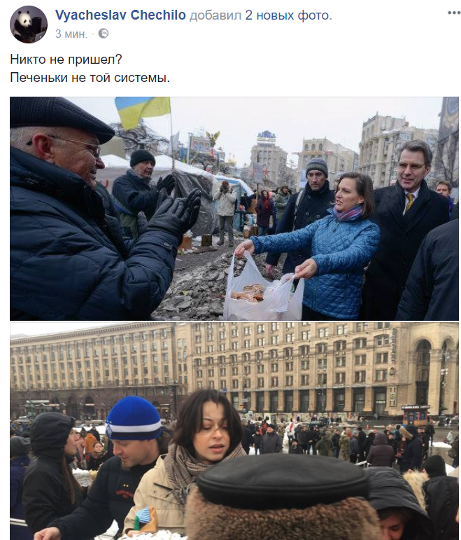 14:27 "Никто не пришел? Печеньки не той системы", - шутит журналист Вячеслав Чечило, сравнивая "кондитерский" митинг сегодня и в дни Евромайдана, когда представитель Госдепа Виктория Нуланд раздавала печенье в центре Киева.
