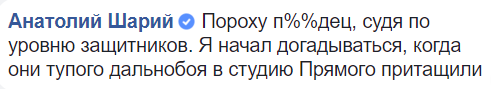 13:12 "Пороху п%%дец, судя по уровню защитников. Я начал догадываться, когда они тупого дальнобоя в студию Прямого притащили", - пишет в Facebook журналист Анатолий Шарий.