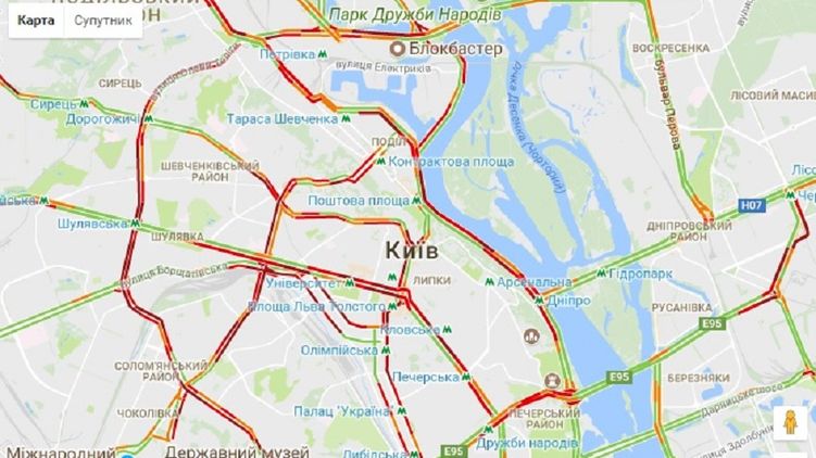Практически по всему городу пробки/Скриншот: infoportal.kiev.ua