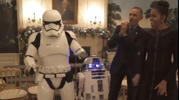 Президент США Барак Обама и его жена Мишель Обама станцевали с героями знаменитой саги "Звездные войны". Компанию им составили имперский штурмовик и робот R2-D2. А плясала компания под песню Uptown Funk британского певца Марка Ронсона и американского исполнителя Бруно Марса. Короткий видеоролик распространила пресс-служба Белого дома.