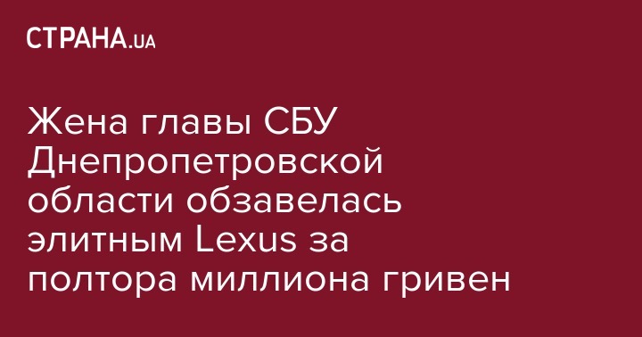 Жена главы управления СБУ в Днепропетровской области Эдуарда Крицына Ирина в сентябре 2017 года зарегистрировала элитное авто Lexus RX200t 2017 года выпуска.