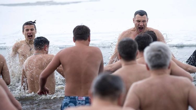 Мэр Киева Виталий Кличко окунулся в прорубь в столичном парке "Наталка". Причем сделал это вместе с главами столичных районов, заместителями председателя КГГА и некоторыми депутатами Верховной Рады и Киевсовета.